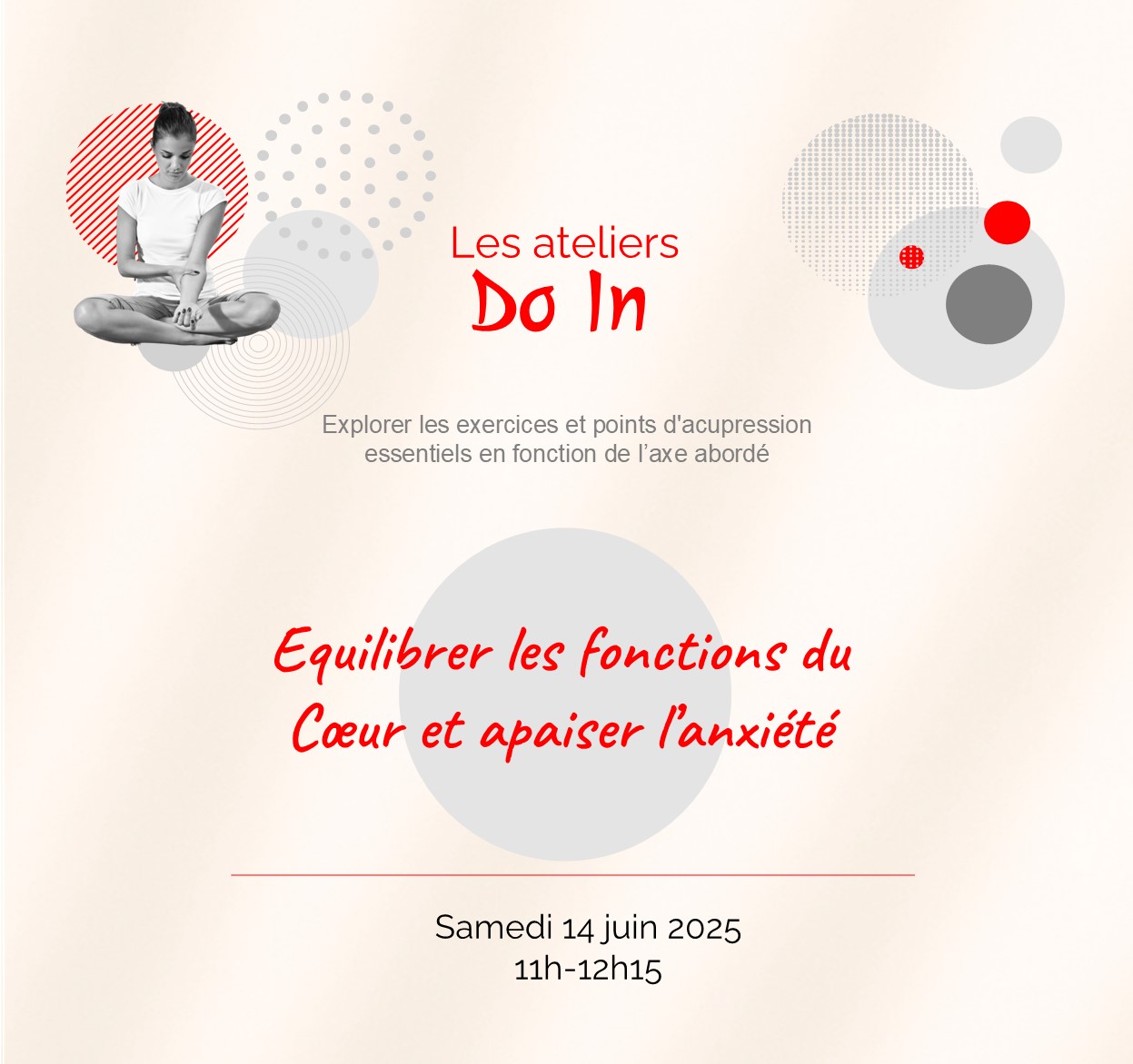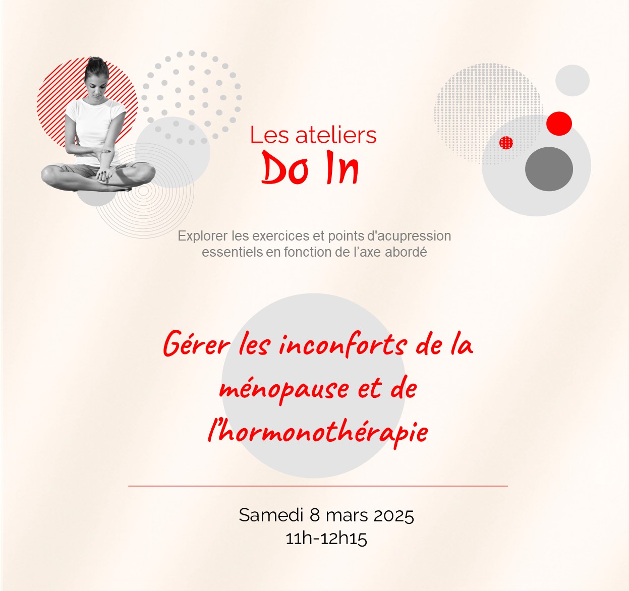 Rejoignez-nous pour explorer les exercices et points d’acupression essentiels en fonction de chaque axe abordé : Comment libérer la respiration ? Quel point pour apaiser les bouffées de chaleur ? Quel massage pour favoriser la digestion ?…