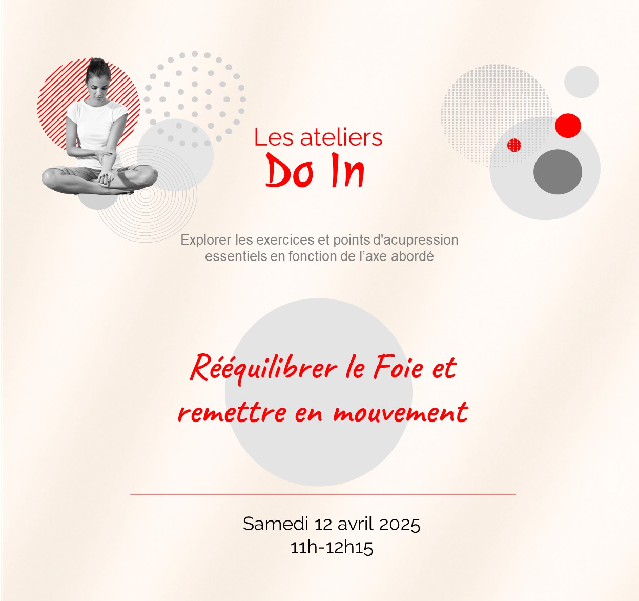 Découvrez les ateliers de Do In, conçus pour aborder des thèmes précis chaque mois. Chaque séance propose des techniques spécifiques pour vous aider à vous sentir mieux, en fonction des saisons ou pour répondre à des problématiques données.